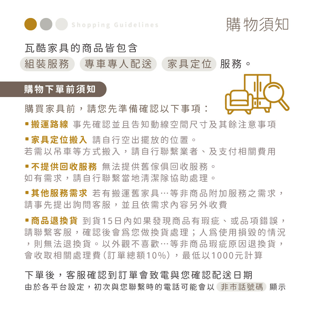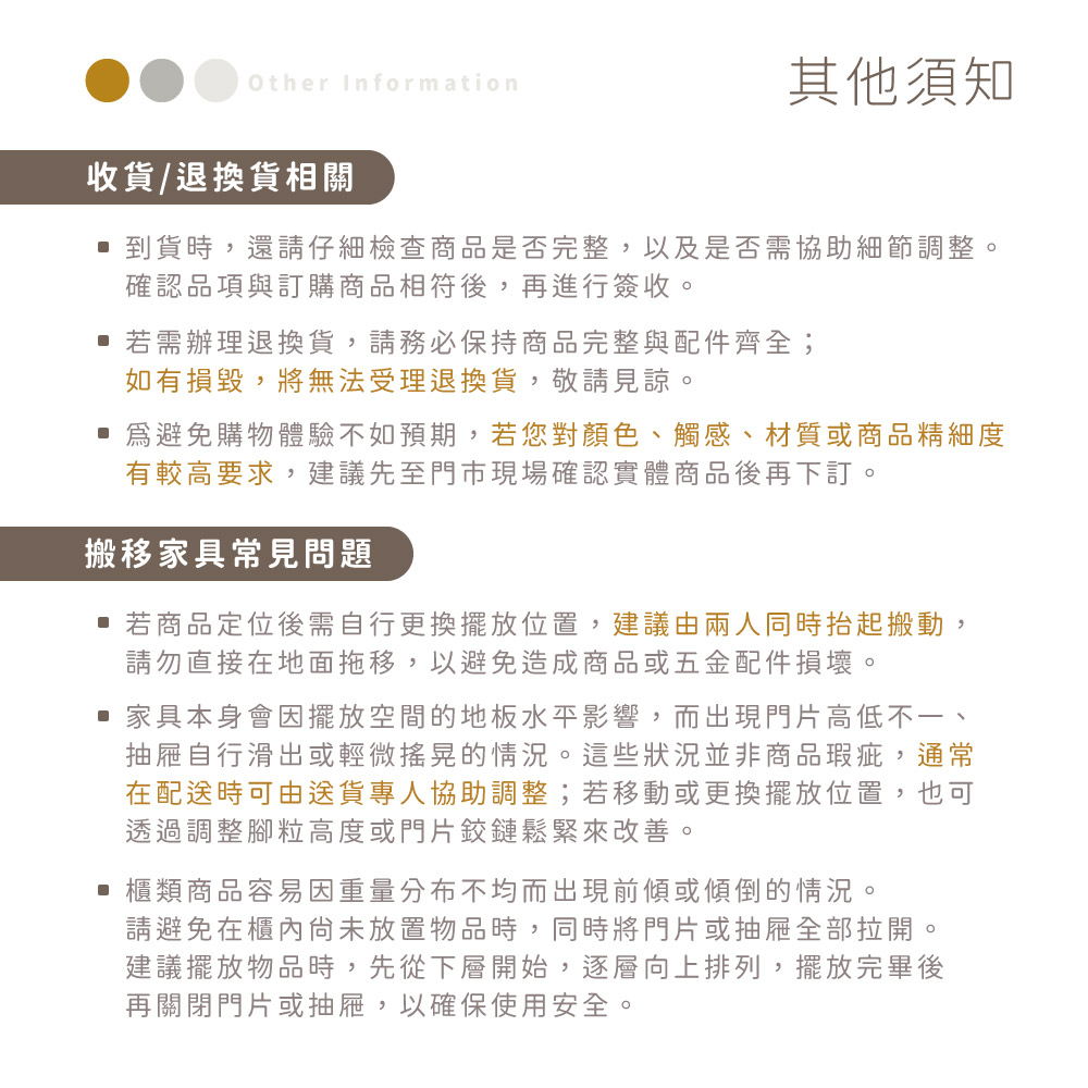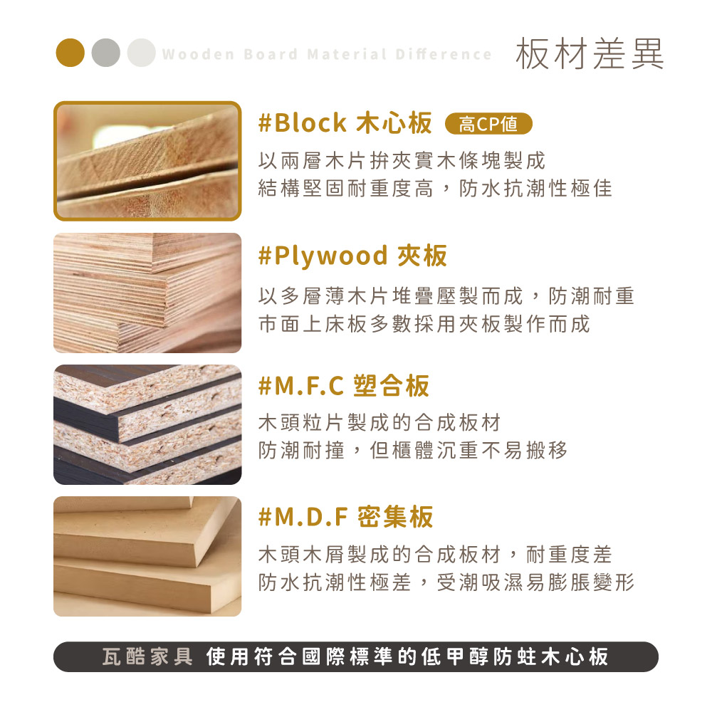 材質 正面、側板採用符合國際標準低甲醛防蛀木心板 抽屜 採用台製三節式鋼珠滑軌 背板 採用美背式處理 腳粒 使用耐磨塑膠腳墊