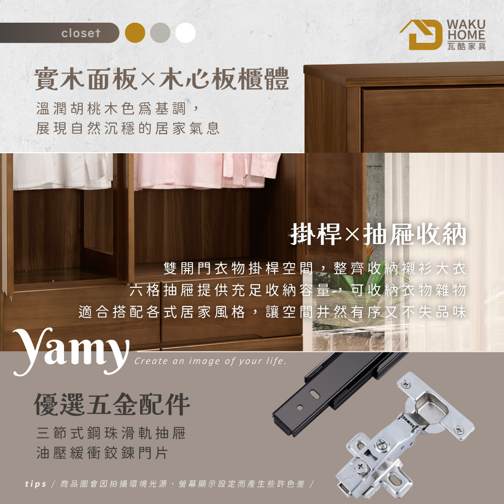 採用符合國際標準低甲醇防蛀木心板 門片採用松木實木板 五金採用油壓緩衝鉸鍊滑門 抽屜採用三節式鋼珠滑軌 掛桿使用可拆式鋁製材質 櫃體採用松木實木材質搭配木心板