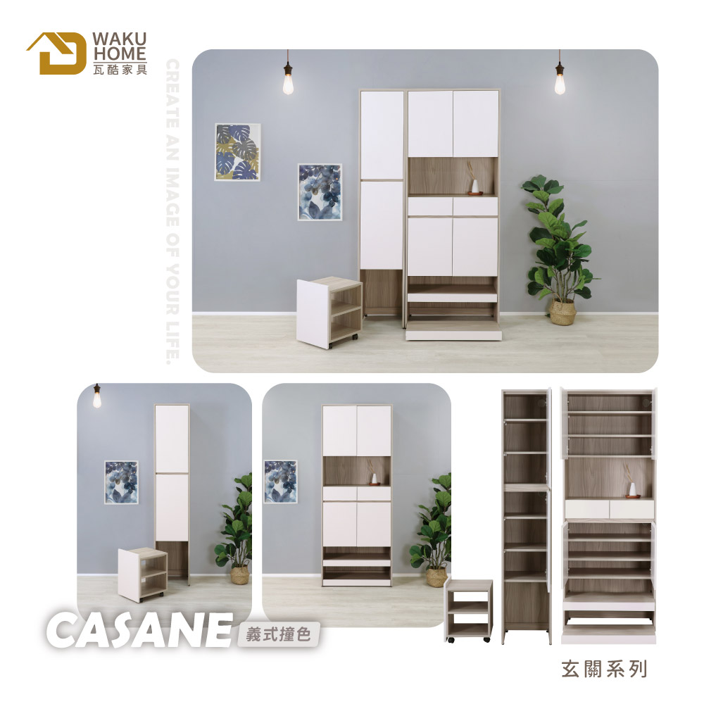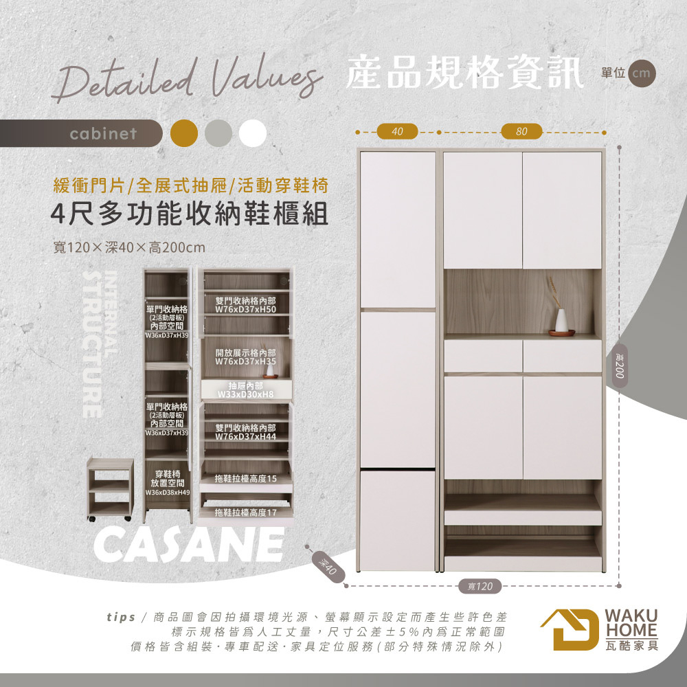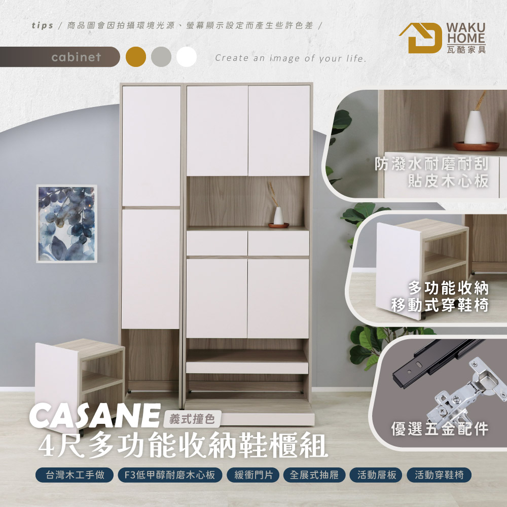 採用符合國際標準低甲醇防蛀耐磨木心板 門片採用油壓緩衝鉸鍊五金 抽屜採用全展示鋼珠滑軌 多格收納搭配移動式穿鞋椅設計