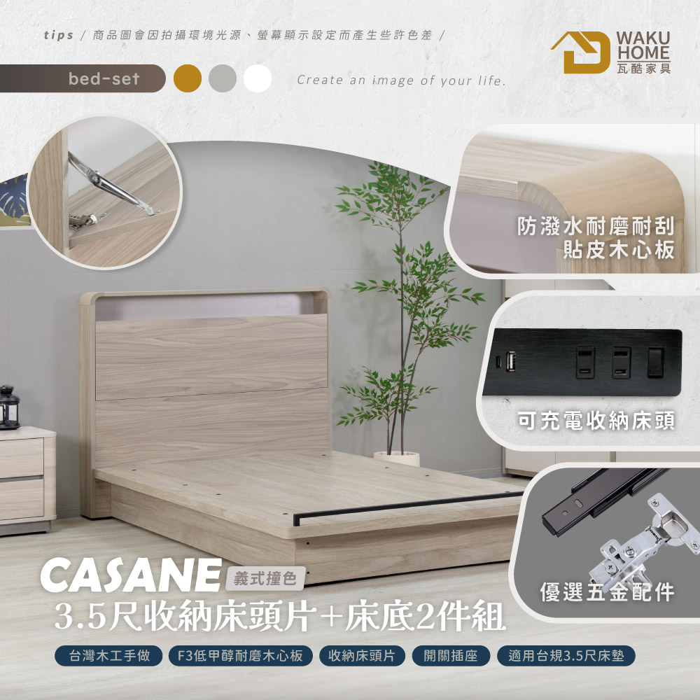 CASANE義式撞色風 3.5尺收納床頭片+床底2件組(附插座)