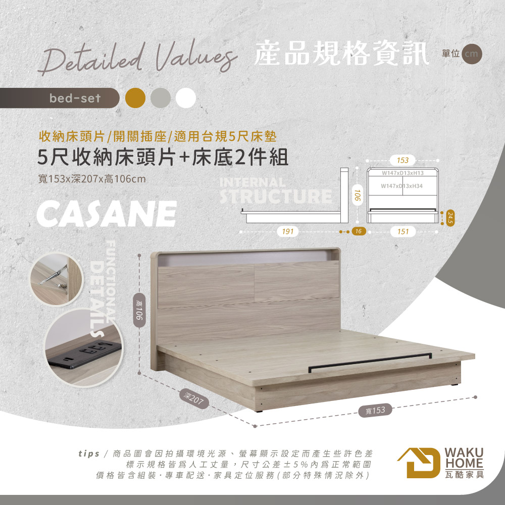 CASANE義式撞色風 5尺收納床頭片+床底2件組(附插座)B001-K885+K891