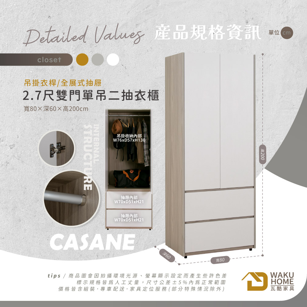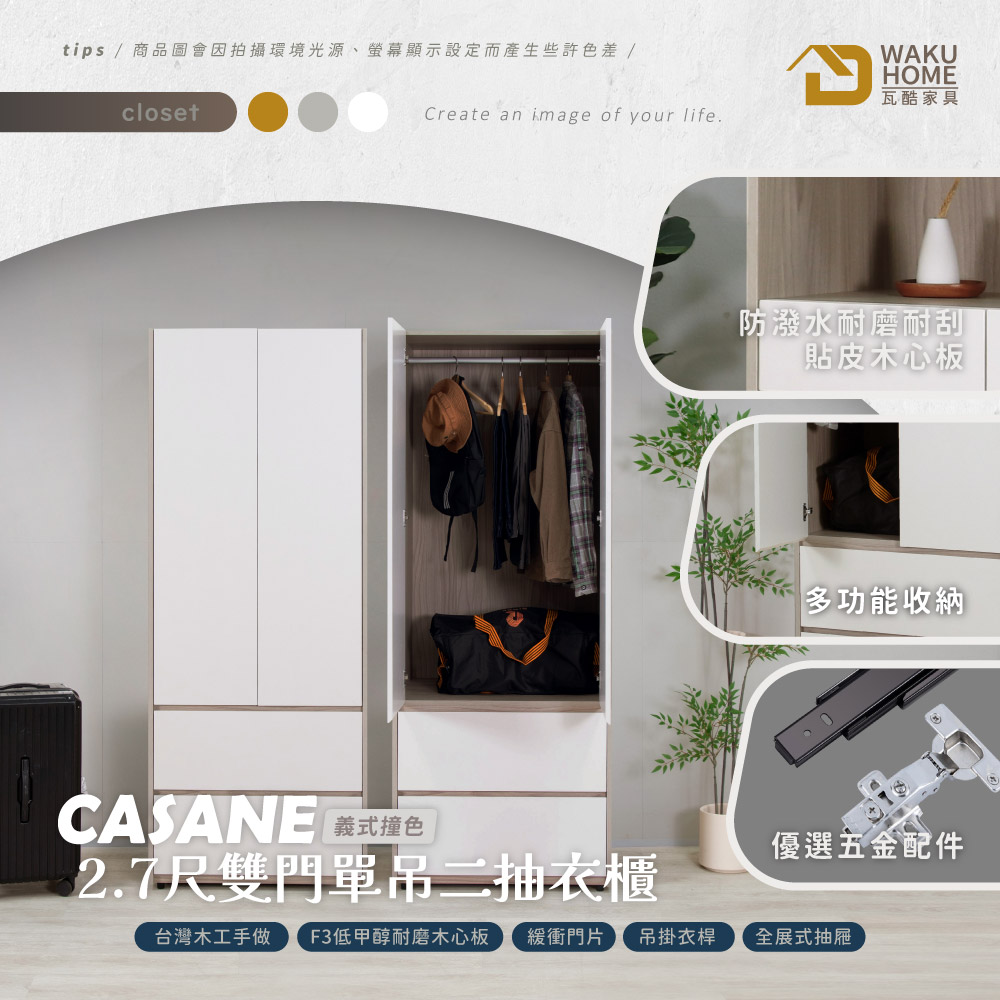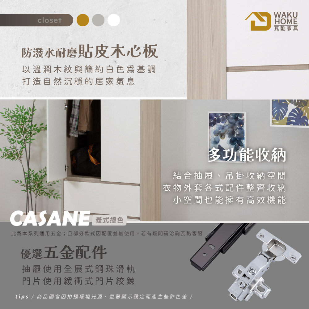 採用符合國際標準低甲醇防蛀耐磨木心板 門片採用油壓緩衝鉸鍊五金 抽屜採用全展示鋼珠滑軌 多格收納搭配吊掛勾