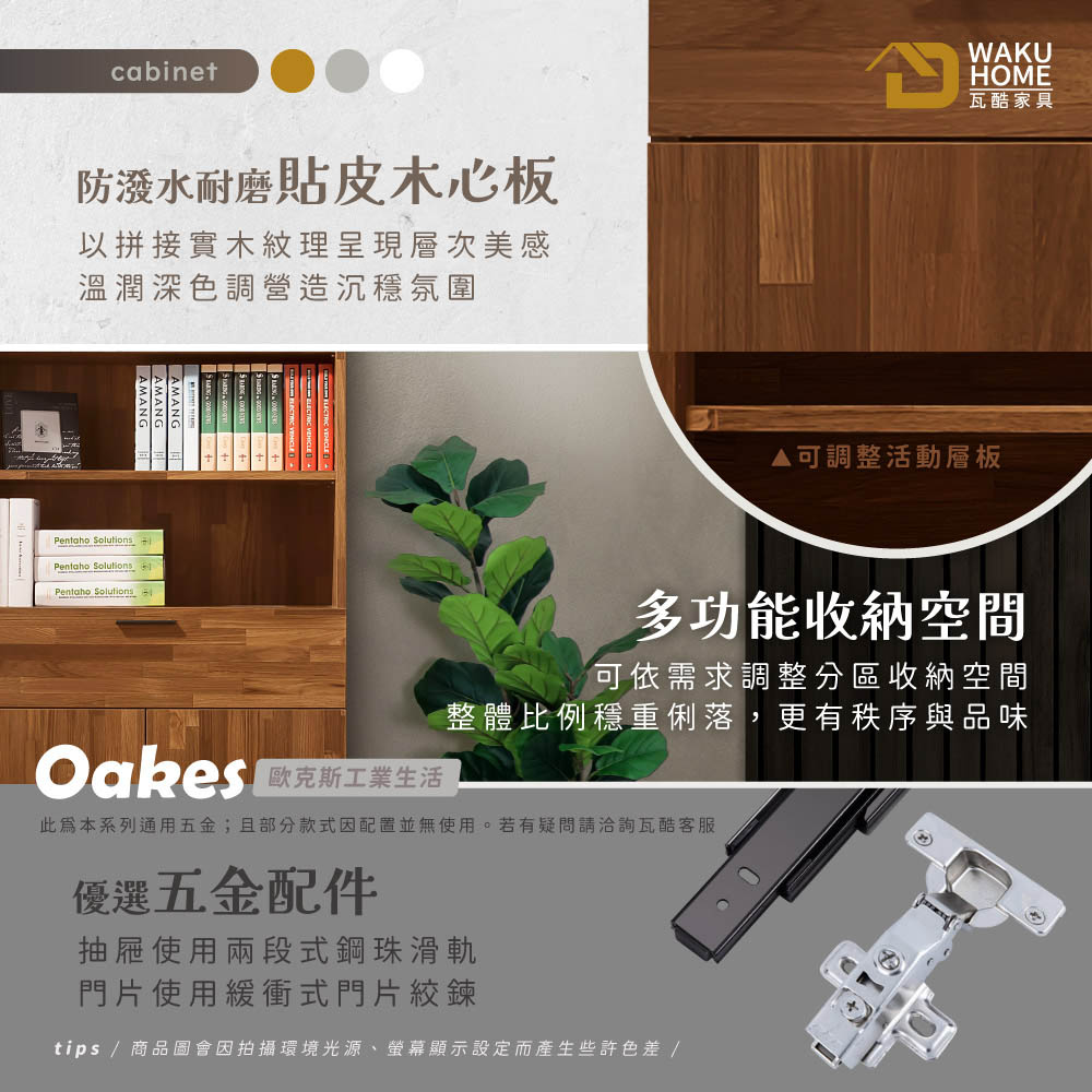 採用符合國際標準低甲醇防蛀耐磨木心板 門片採用緩衝式鉸鍊五金 抽屜採用兩段式鋼珠滑軌 手把採用台灣製造鋁合金烤漆手把 腳座採黑砂粉體烤漆腳座 以拼接實木紋理防潑水耐磨貼皮 多格收納空間搭配電器出線孔