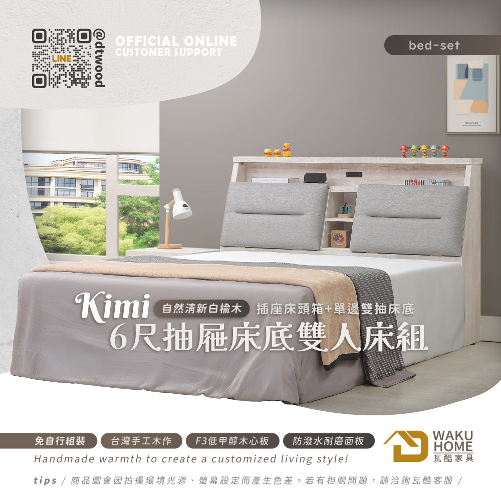 1.符合國際標準低甲醛防蛀木心板 2.床頭片使用PVC耐磨皮革靠墊 3.設置2P三插延長插座 4.抽屜採用鋼珠滑軌