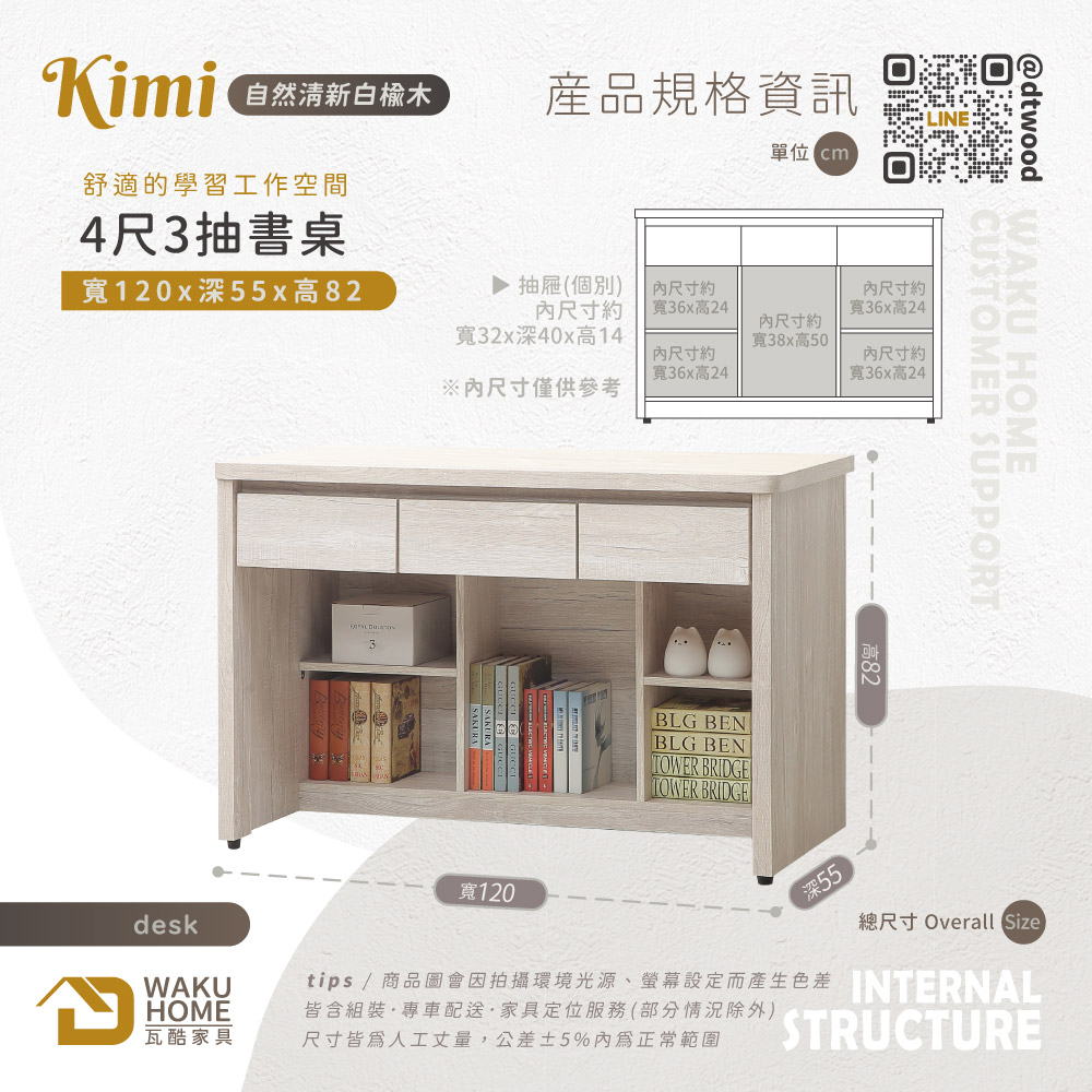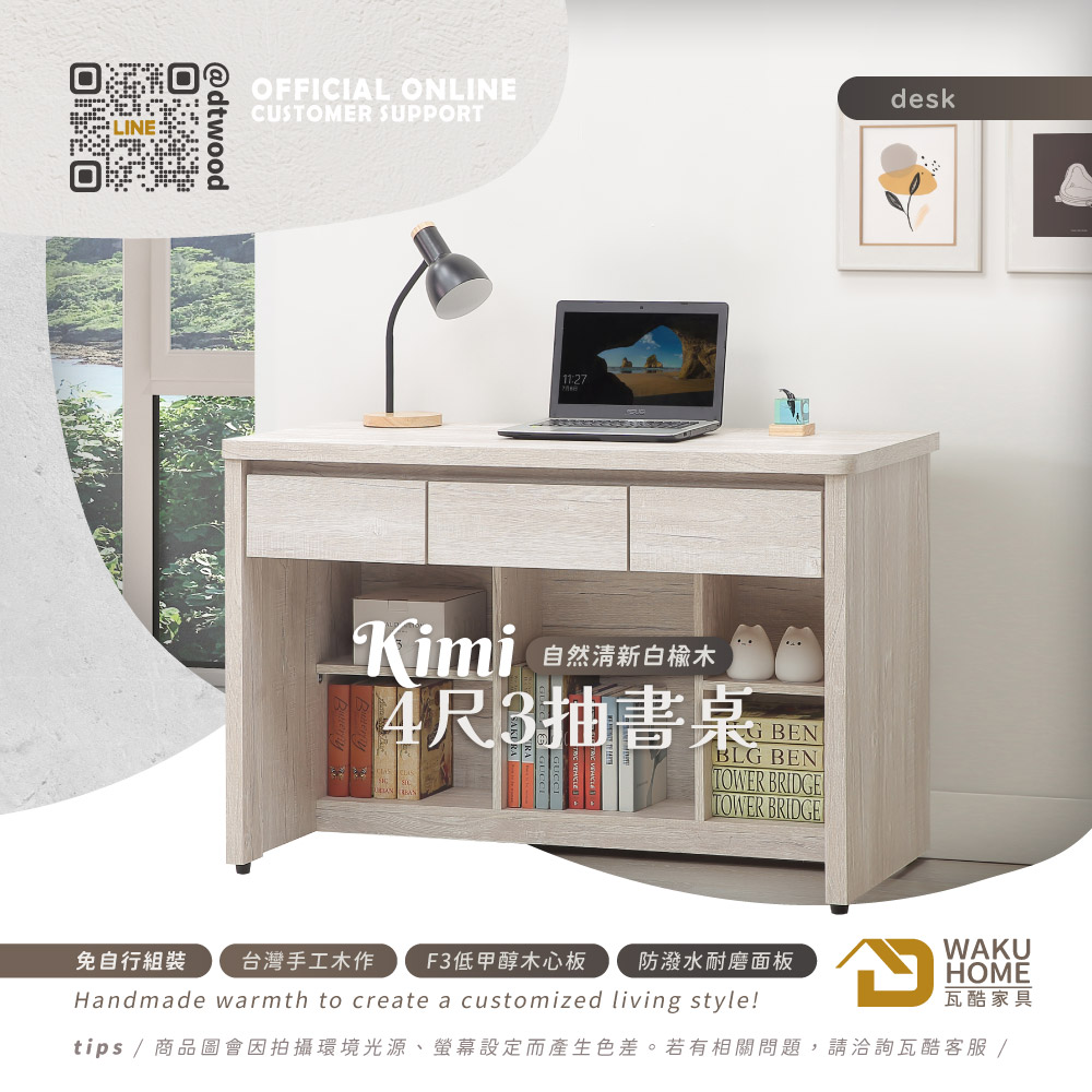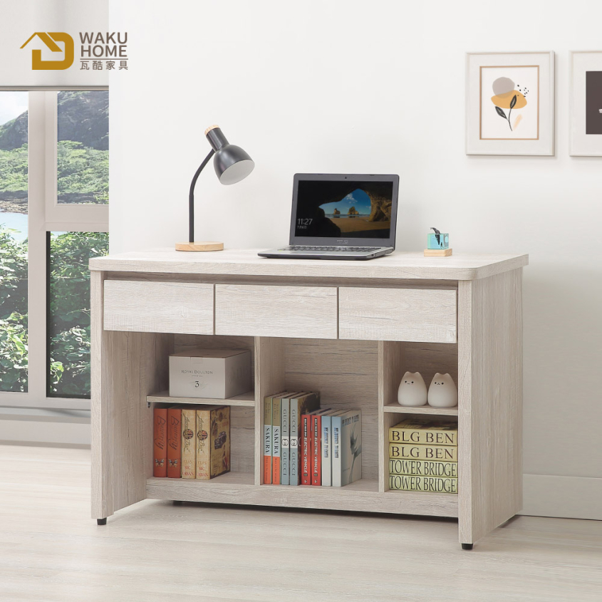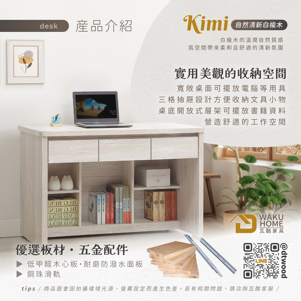 Kimi自然清新白榆木4尺3抽書桌A005-773