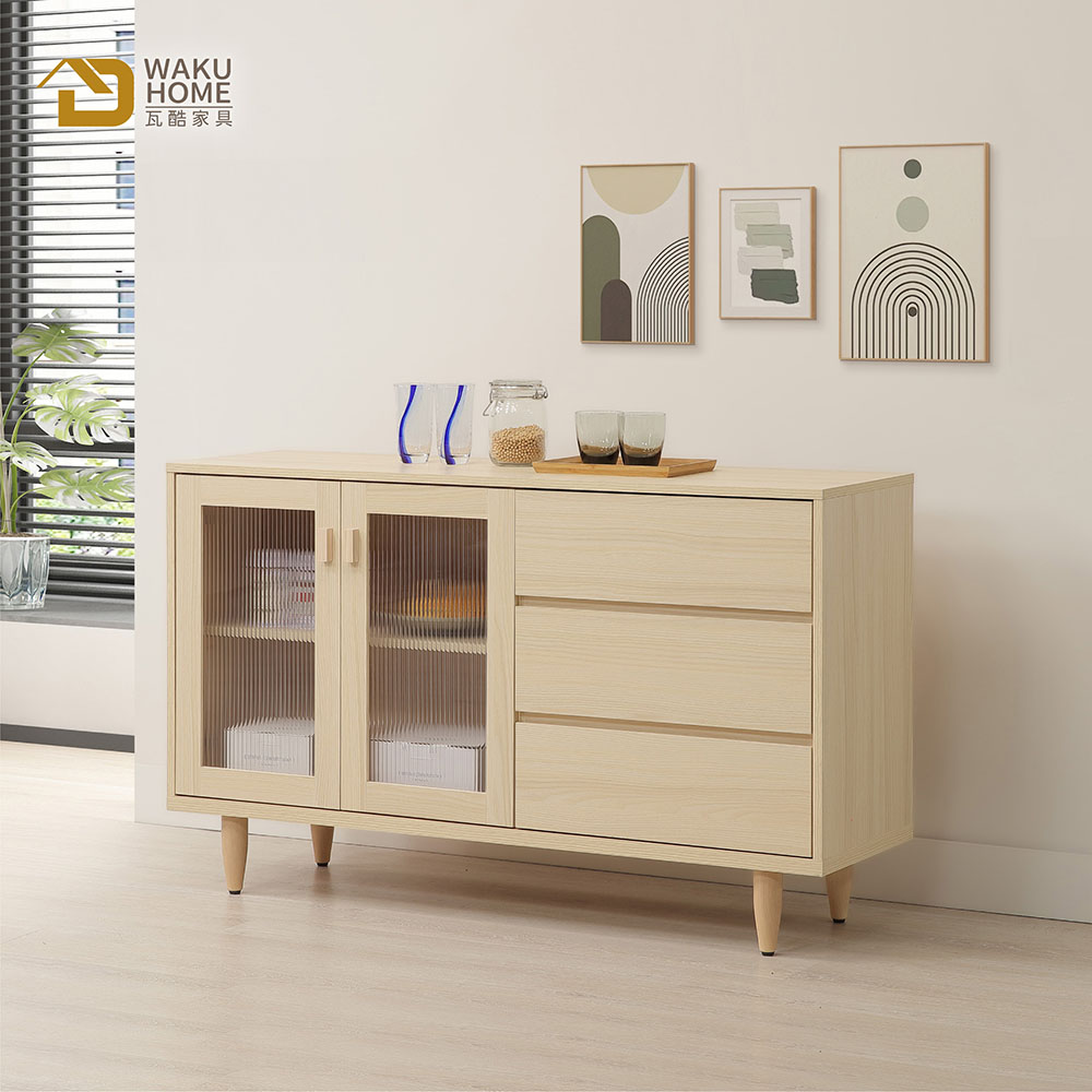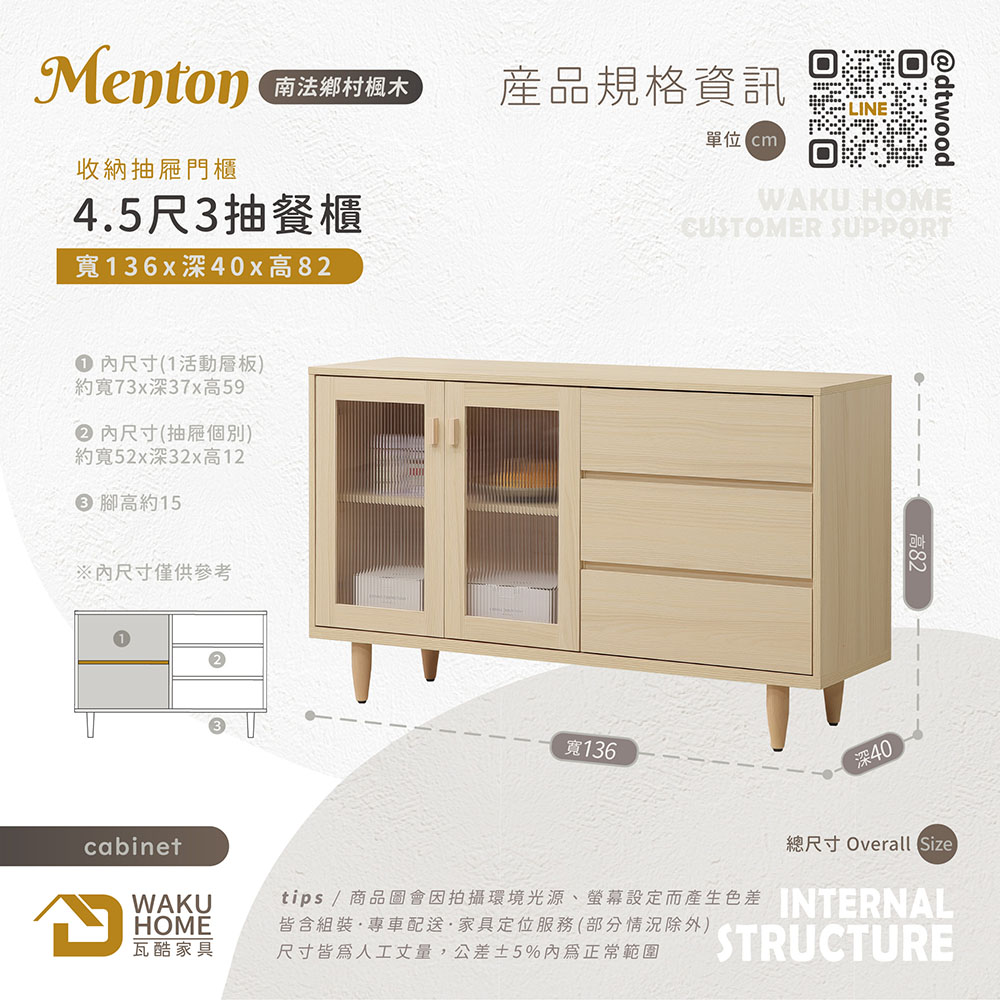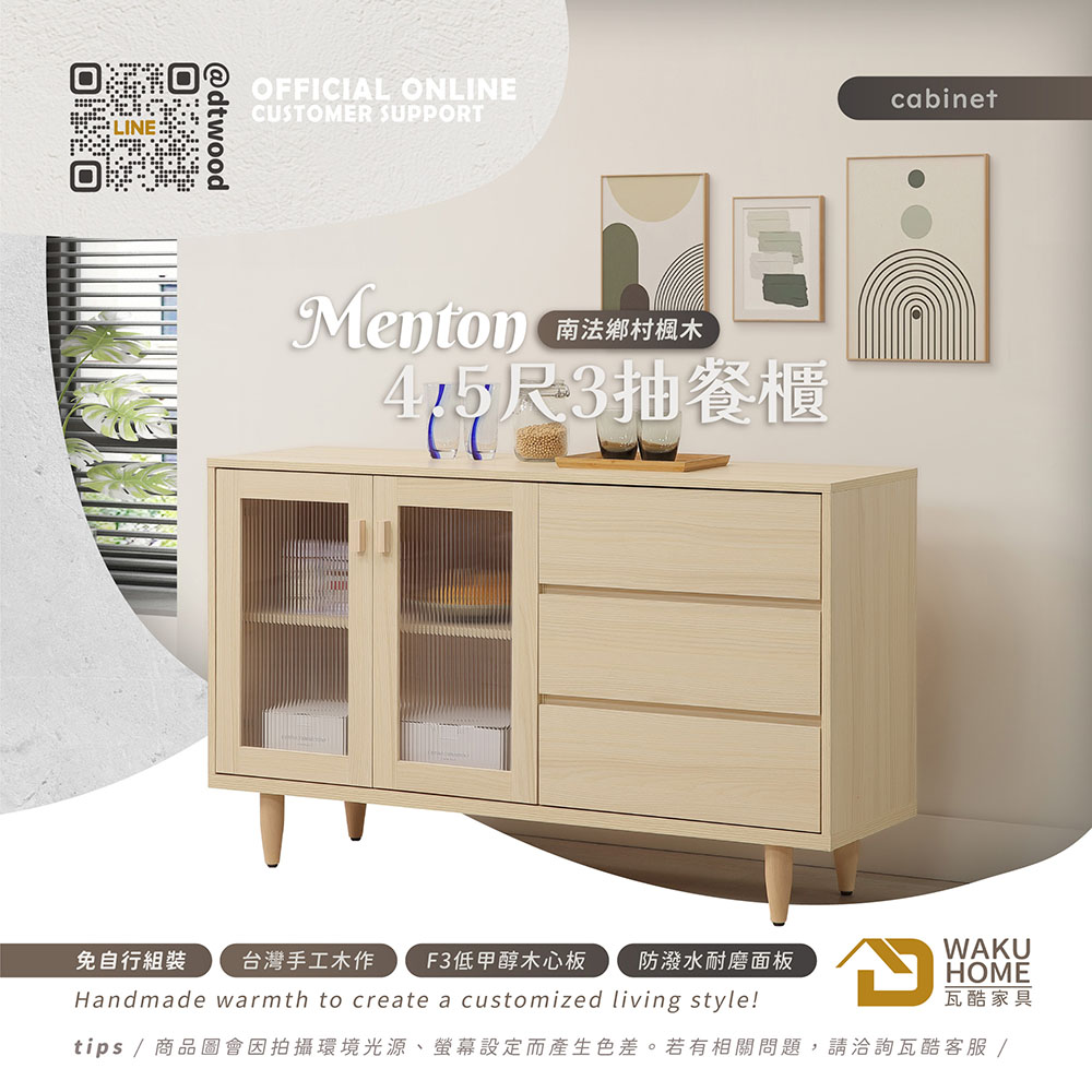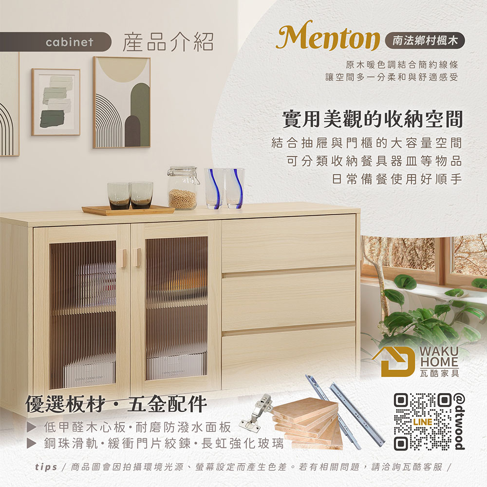 1.符合國際標準低甲醛防蛀木心板 2.採用防潑水耐磨面板 3.抽屜採用鋼珠滑軌五金 4.門片採緩衝鉸鍊五金 5.採用木製櫃腳